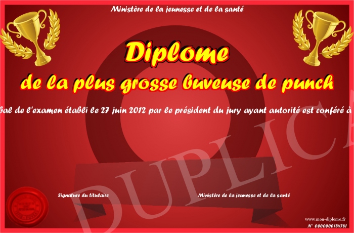 Envoyez par email votre Diplôme de la plus grosse buveuse de punch personalisé