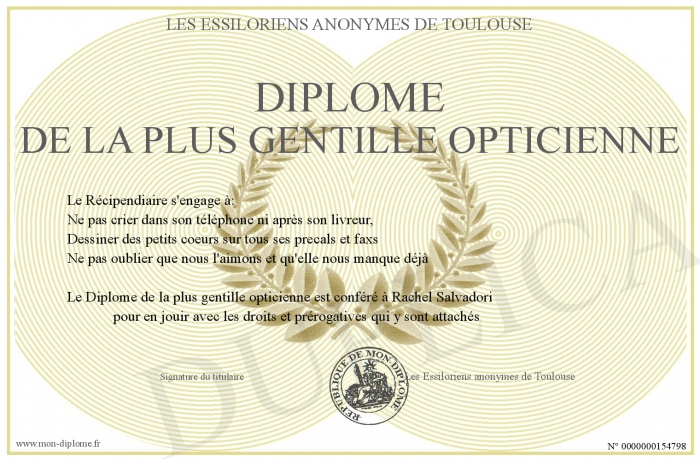 Envoyez par email votre Diplôme de la plus gentille opticienne personalisé