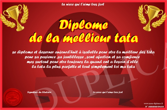 Envoyez par email votre Diplôme de la mellieur tata personalisé
