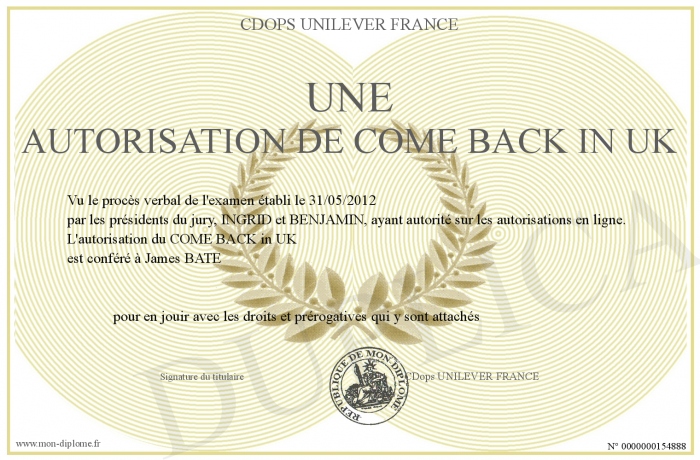 Envoyez par email votre Une autorisation de COME BACK in UK personalisé