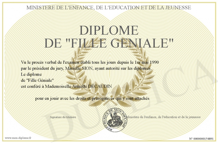 Envoyez par email votre Diplôme de -Fille Géniale- personalisé