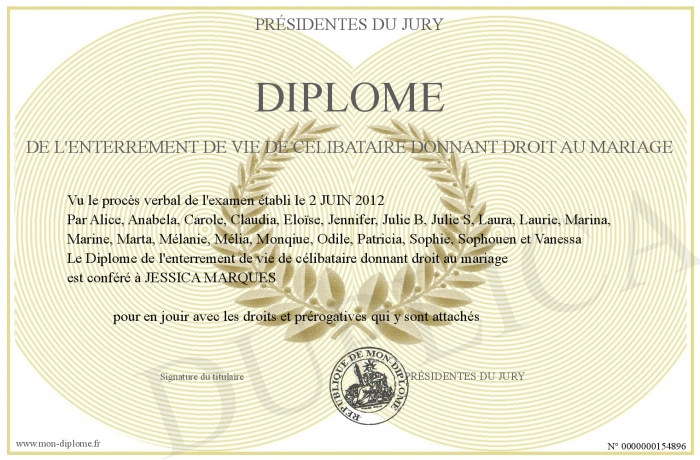 Envoyez par email votre Diplôme de l'enterrement de vie de célibataire donnant droit au mariage personalisé
