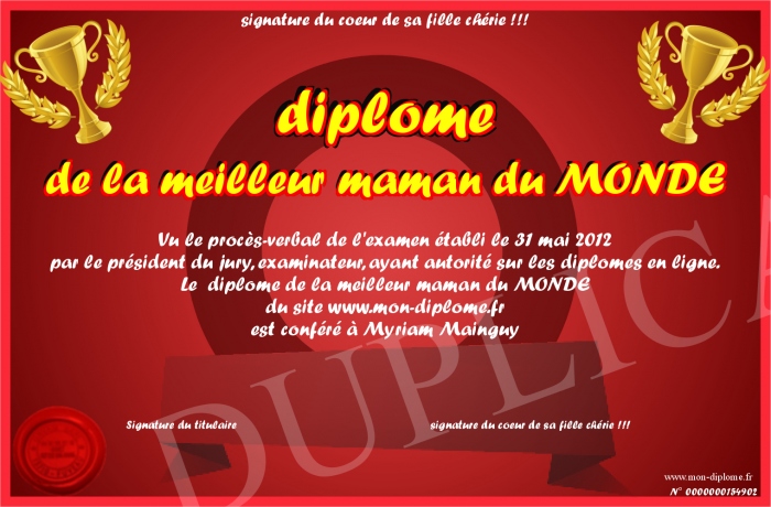 Envoyez par email votre diplome de la meilleur maman du MONDE personalisé