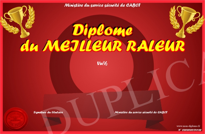 Envoyez par email votre Diplôme du MEILLEUR RALEUR personalisé