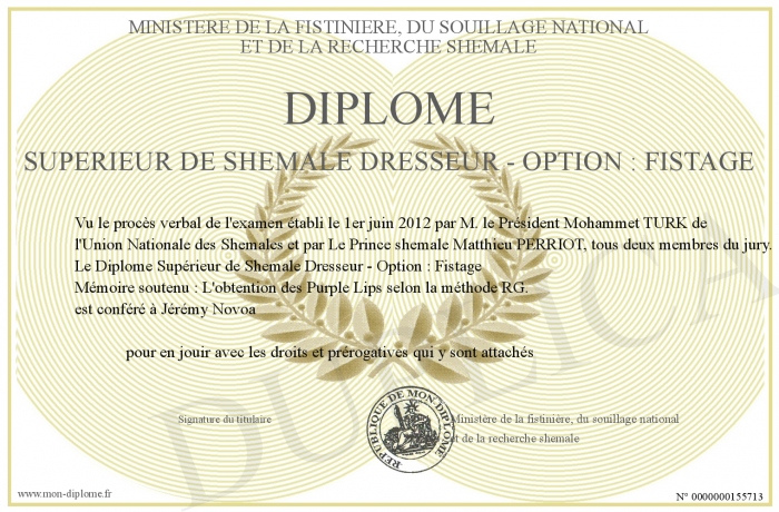 Envoyez par email votre Diplôme Supérieur de Shemale Dresseur - Option : Fistage personalisé