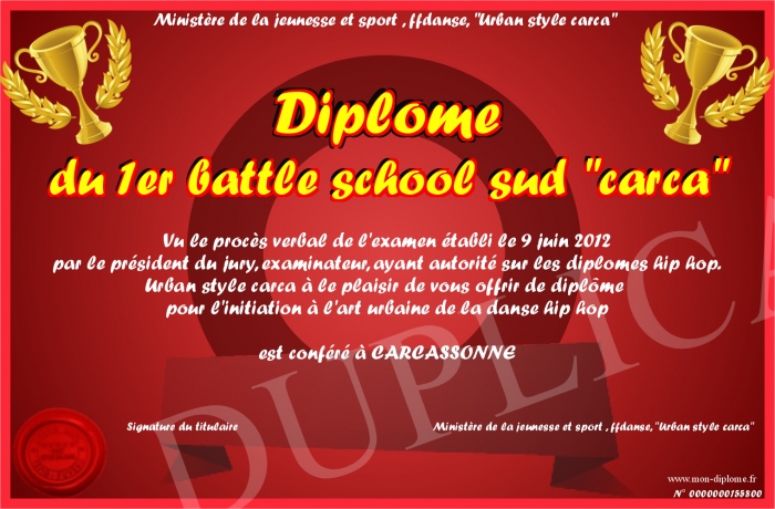 Envoyez par email votre Diplôme du 1er battle school sud -carca- personalisé