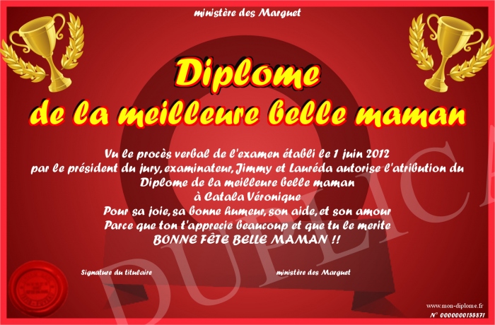 Envoyez par email votre Diplôme de la meilleure belle maman personalisé