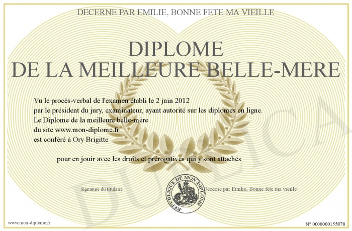 Envoyez par email votre Diplôme de la meilleure belle-mère personalisé