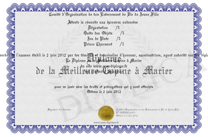 Envoyez par email votre Diplôme de la Meilleure Copine à Marier personalisé
