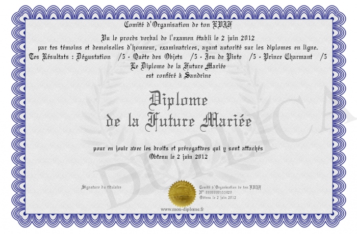 Envoyez par email votre Diplôme de la Future Mariée personalisé