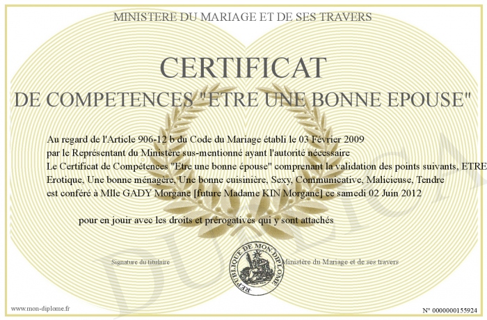 Envoyez par email votre Certificat de Compétences -Etre une bonne épouse- personalisé
