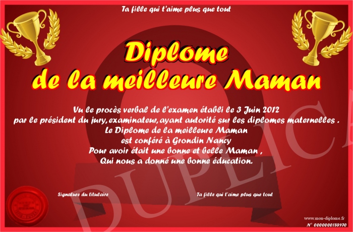 Envoyez par email votre Diplome de la meilleure Maman personalisé