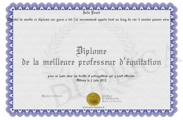 Envoyez par email votre Diplôme de la meilleure professeur d'équitation personalisé