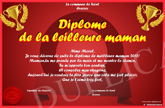Envoyez par email votre Diplome de la leilleure maman personalisé