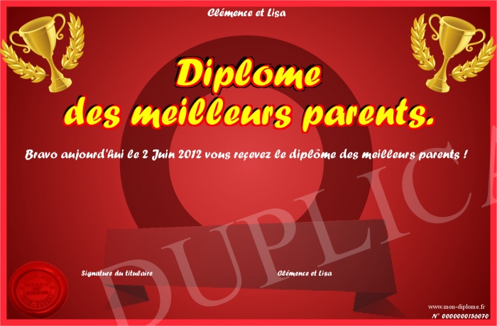 Envoyez par email votre Diplôme des meilleurs parents. personalisé