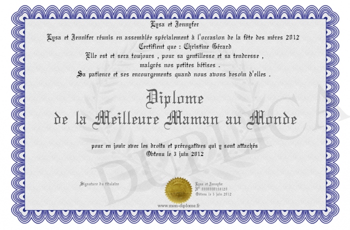Envoyez par email votre Diplôme de la Meilleure Maman au Monde personalisé