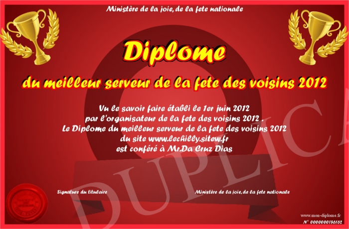 Envoyez par email votre Diplôme du meilleur serveur de la fete des voisins 2012 personalisé