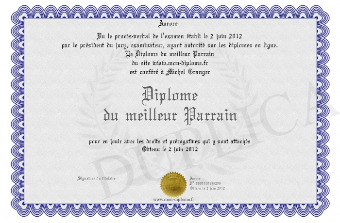 Envoyez par email votre Diplôme du meilleur Parrain personalisé