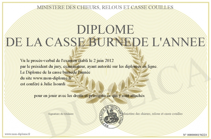 Envoyez par email votre Diplôme de la casse burnede l'année personalisé