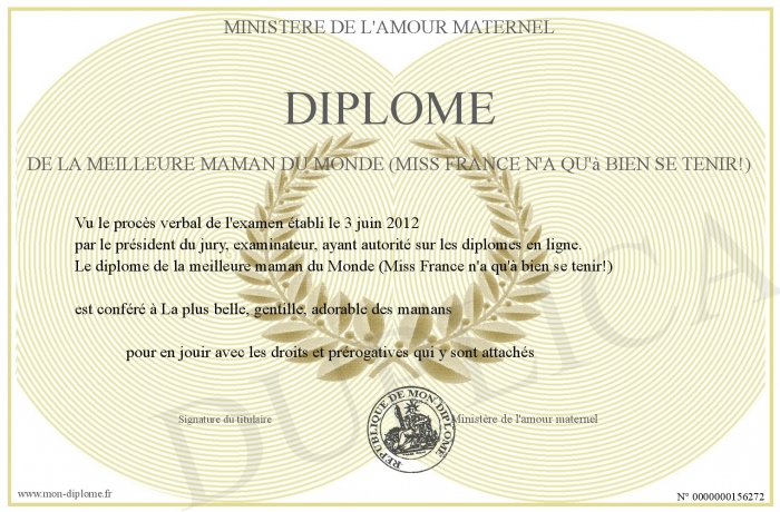 Envoyez par email votre diplôme de la meilleure maman du Monde (Miss France n'a qu'à bien se tenir!) personalisé