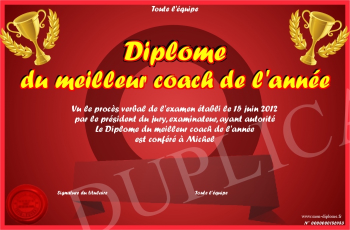 Envoyez par email votre Diplôme du meilleur coach de l'année personalisé