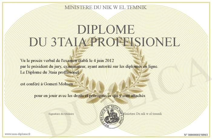 Envoyez par email votre Diplôme du 3taia proffisionel personalisé