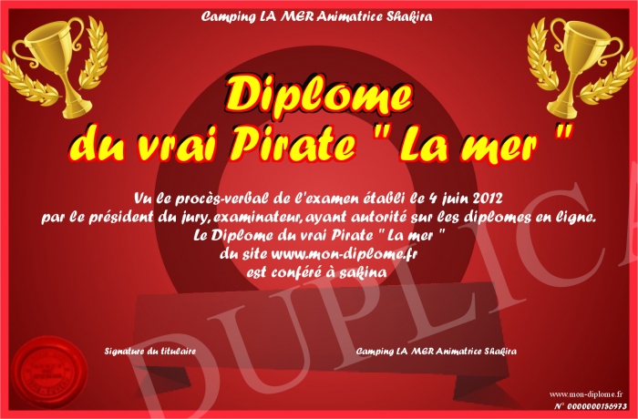 Envoyez par email votre Diplôme du vrai Pirate - La mer - personalisé