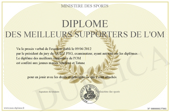 Envoyez par email votre Diplôme des meilleurs supporters de l'OM personalisé