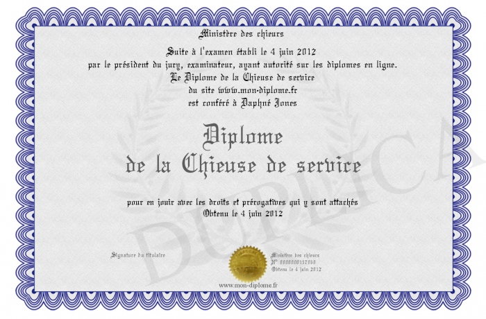 Envoyez par email votre Diplôme de la Chieuse de service personalisé