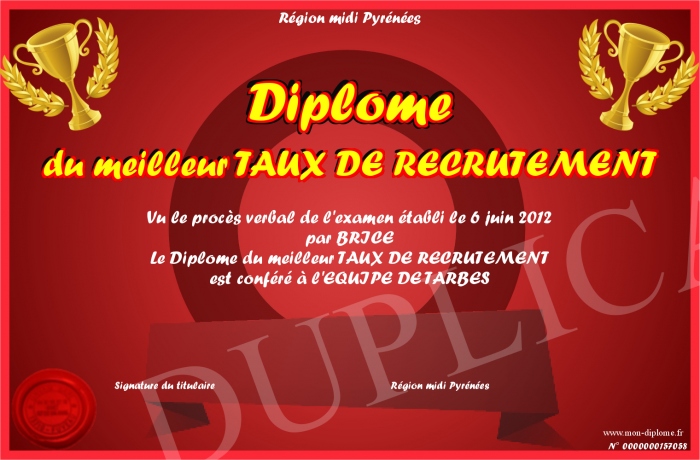 Envoyez par email votre Diplôme du meilleur TAUX DE RECRUTEMENT personalisé