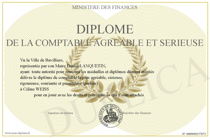 Envoyez par email votre Diplome de la comptable agréable et sérieuse personalisé