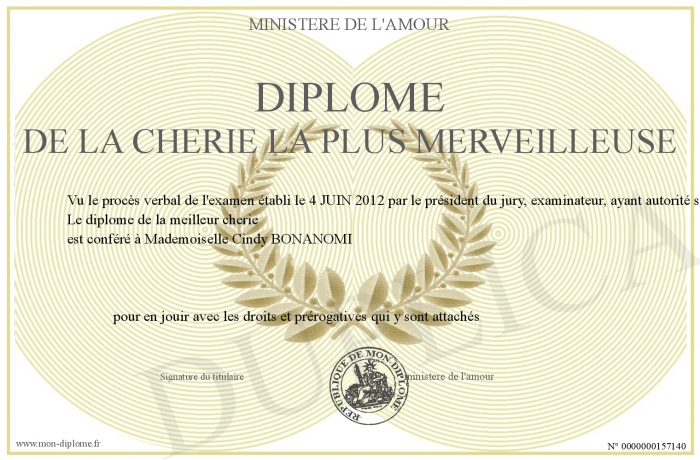 Envoyez par email votre Diplôme de la cherie la plus merveilleuse personalisé