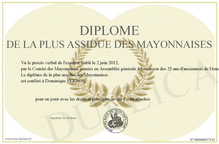 Envoyez par email votre Diplôme de la plus assidue des Mayonnaises personalisé