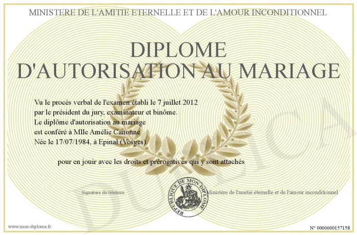 Envoyez par email votre Diplôme d'autorisation au mariage personalisé