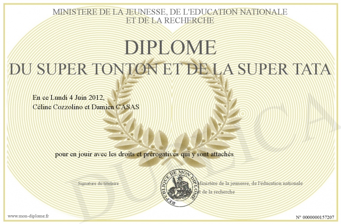 Envoyez par email votre Diplôme du super Tonton et de la super Tata personalisé