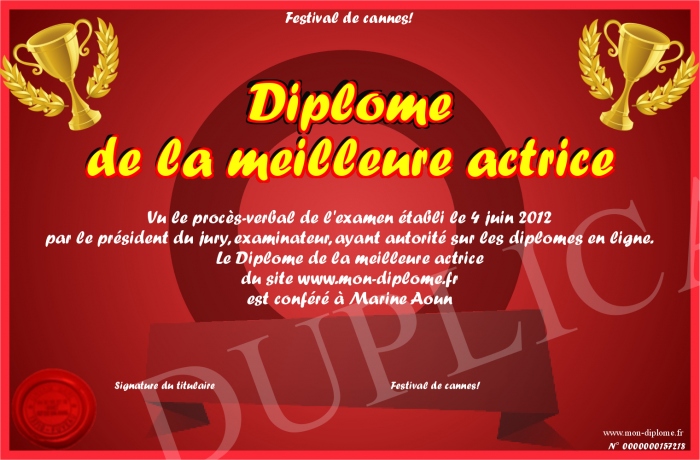 Envoyez par email votre Diplome de la meilleure actrice personalisé