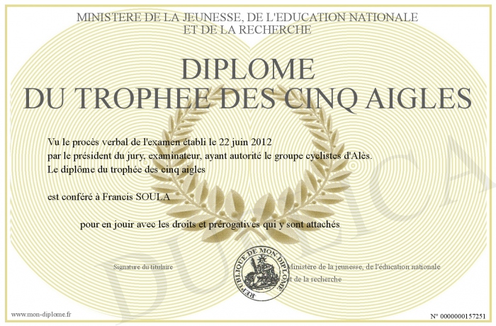 Envoyez par email votre Diplôme du trophée des cinq aigles personalisé