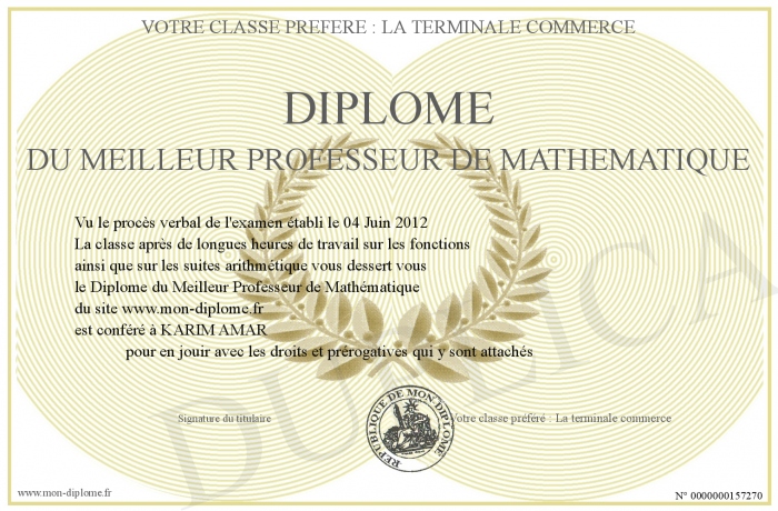 Envoyez par email votre Diplôme du Meilleur Professeur de Mathématique personalisé