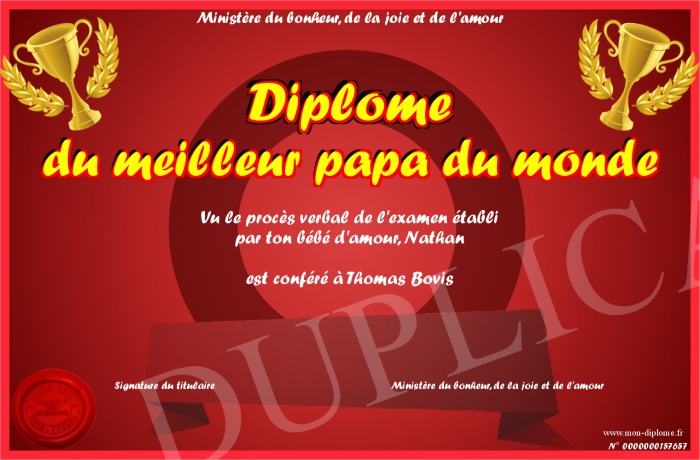 Envoyez par email votre Diplôme du meilleur papa du monde personalisé