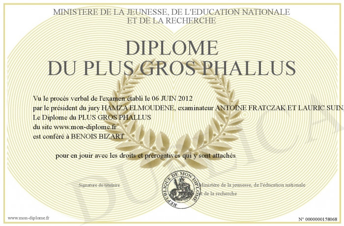 Envoyez par email votre Diplôme du PLUS GROS PHALLUS personalisé
