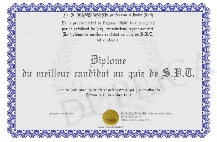 Envoyez par email votre Diplôme du meilleur candidat au quiz de S.V.T. personalisé
