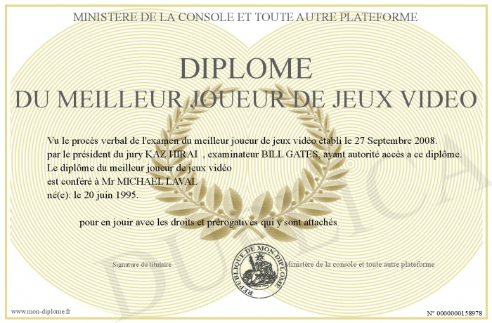 Envoyez par email votre Diplôme du meilleur joueur de jeux video personalisé