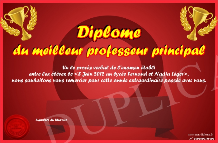 Envoyez par email votre Diplome du meilleur professeur principal personalisé