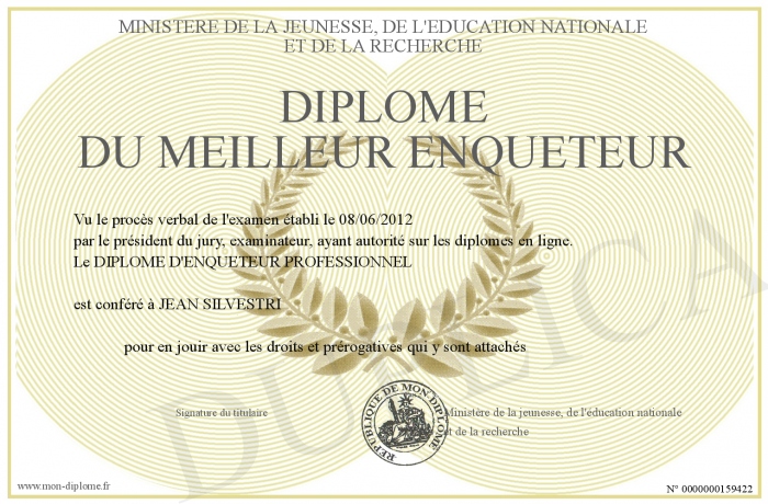 Envoyez par email votre Diplôme du MEILLEUR ENQUETEUR personalisé