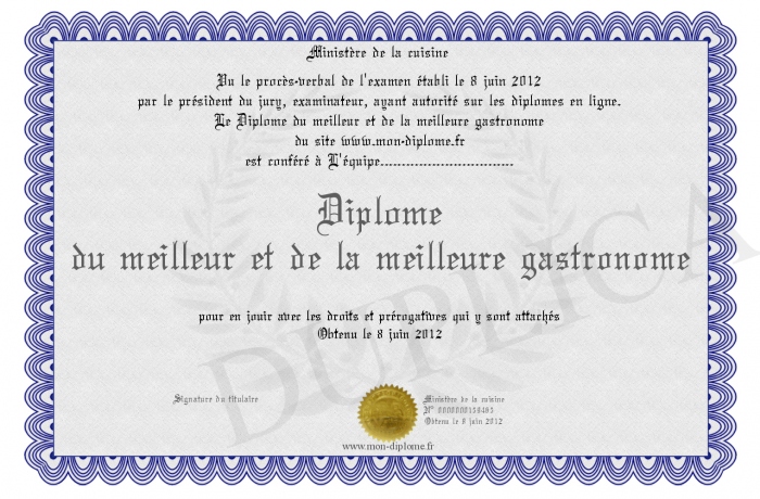 Envoyez par email votre Diplôme du meilleur et de la meilleure gastronome personalisé