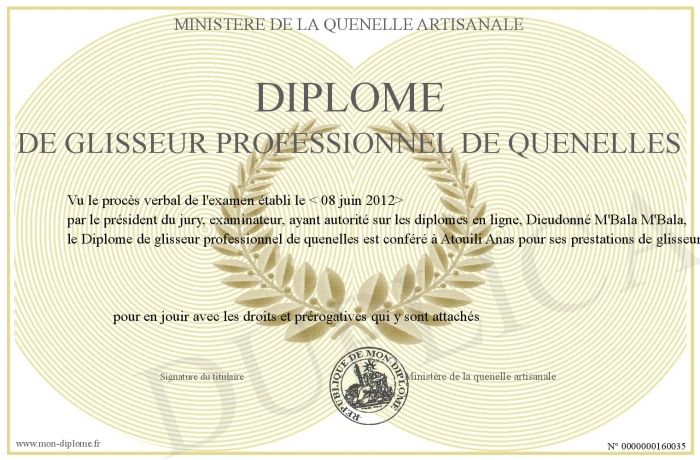Envoyez par email votre Diplôme de glisseur professionnel de quenelles personalisé