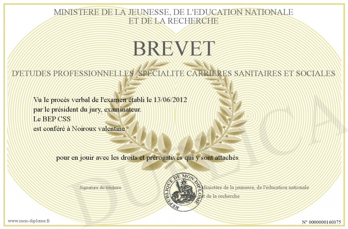 Envoyez par email votre Brevet d'Etudes Professionnelles spécialité carrières sanitaires et sociales personalisé