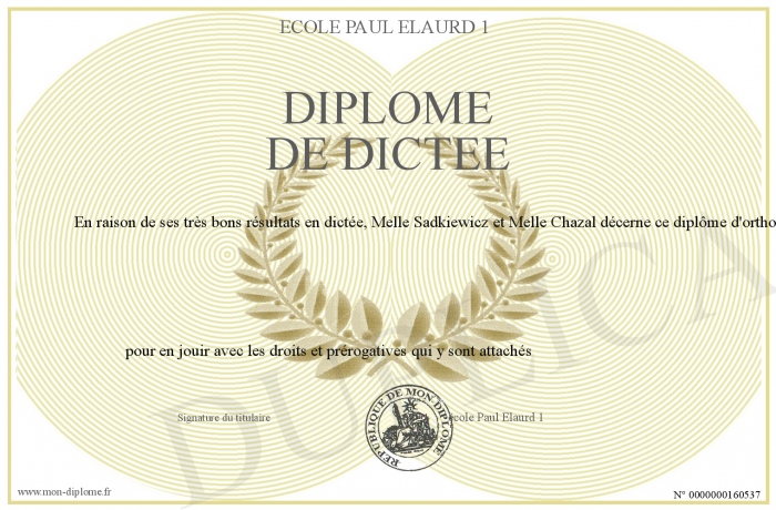 Envoyez par email votre Diplome de dictée personalisé
