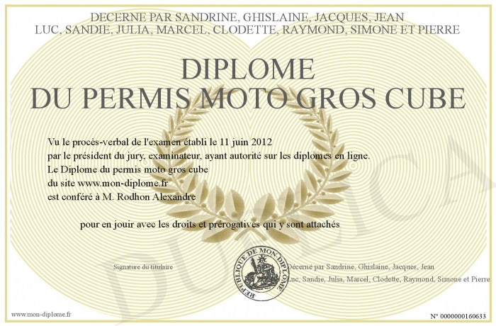 Envoyez par email votre Diplôme du permis moto gros cube personalisé