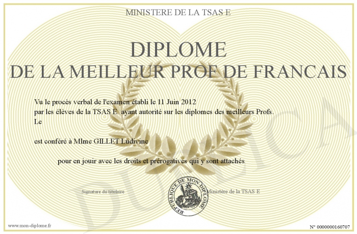 Envoyez par email votre Diplôme de la meilleur prof de francais personalisé